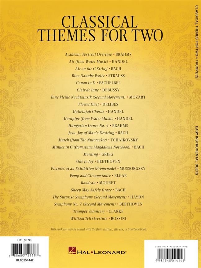 24 favorite melodies from top classical composers in easy duet arrangements for two instrumentalists are featured in this collection, including: Air on the G String - Blue Danube Waltz - Canon in D - Eine Kleine Nachtmusik - Hallelujah Chorus - Jesu, Joy of Man's Desiring - Minuet in G Major - Ode to Joy - Pictures at an Exhibition - Sheep May Safely Graze - Trumpet Voluntary - William Tell Overture - and more. Arrangements work for two clarinets or can be used with the other woodwind titles from this series.