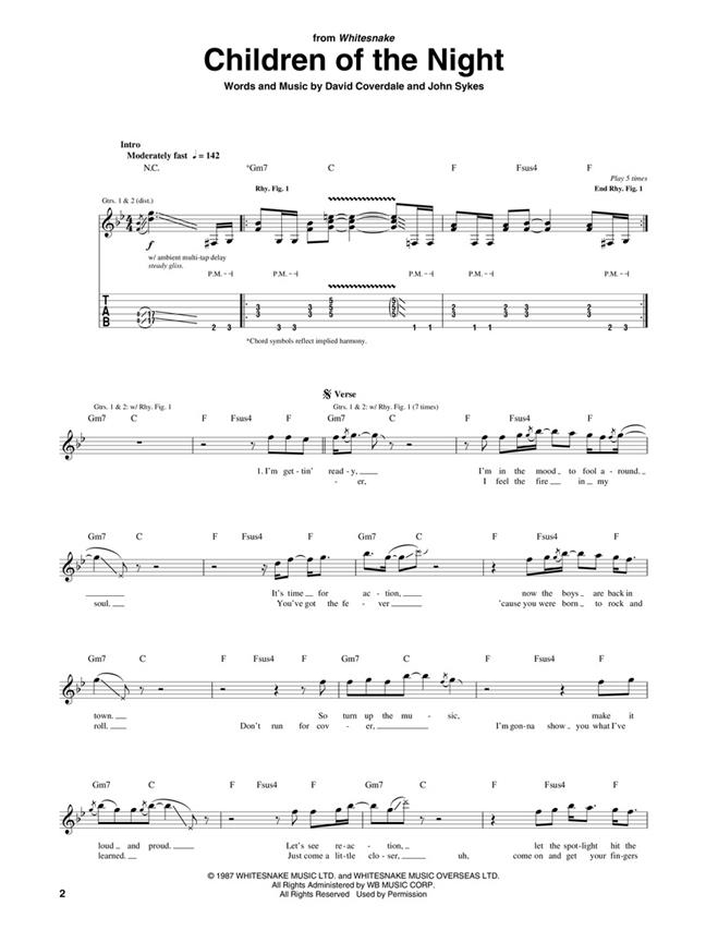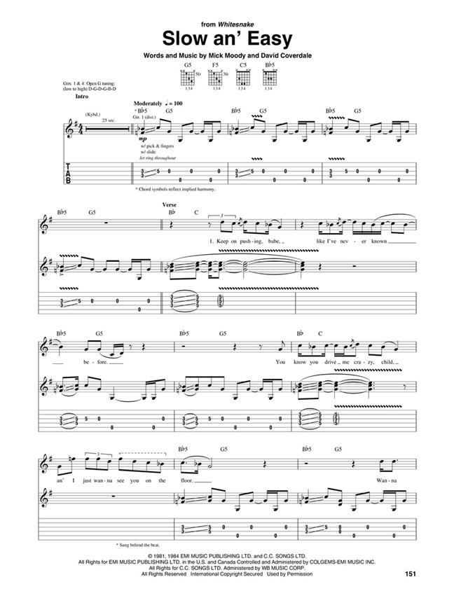 Une douzaine des plus grands succès du groupe metal des années 80 Whitesnake sont transcrits ici en notation standard et tablature pour guitare. Inclut : Enfants de la nuit - Pleurant sous la pluie - Fou pour ton amour - Donne-moi tout ton amour - Me voilà encore - Est-ce de l’amour - L’amour n’est pas un étranger - Voiliers - Glisse-le - Glissez-le - Glissez-le - Lentement et facilement - Immobile de la nuit.