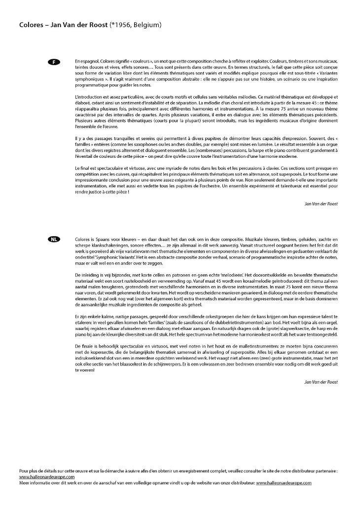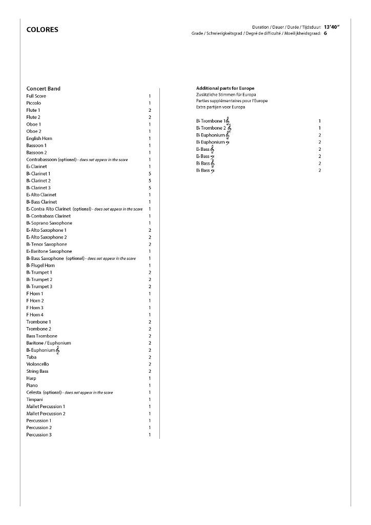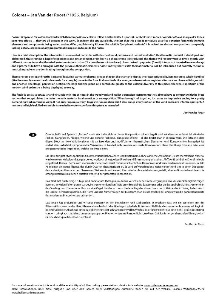 En espagnol, Colores signifie « couleurs », un mot que cette composition cherche à refléter et exploiter. Couleurs, timbres et sons musicaux, teintes douces et vives, effets sonores… Tous sont présents dans cette œuvre. Il s’agit d’une composition abstraite : elle ne s’appuie pas sur une histoire, un scénario ou une inspiration programmatique pour guider les notes. La musique parle d’elle-même. Tous les pupitres sont mis en lumière dans une œuvre extrêmement variée et très exigeante pour les musiciens. Mettez le paquet pour produire le meilleur résultat possible !