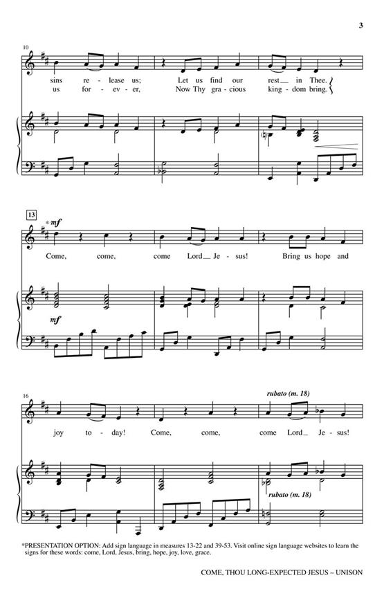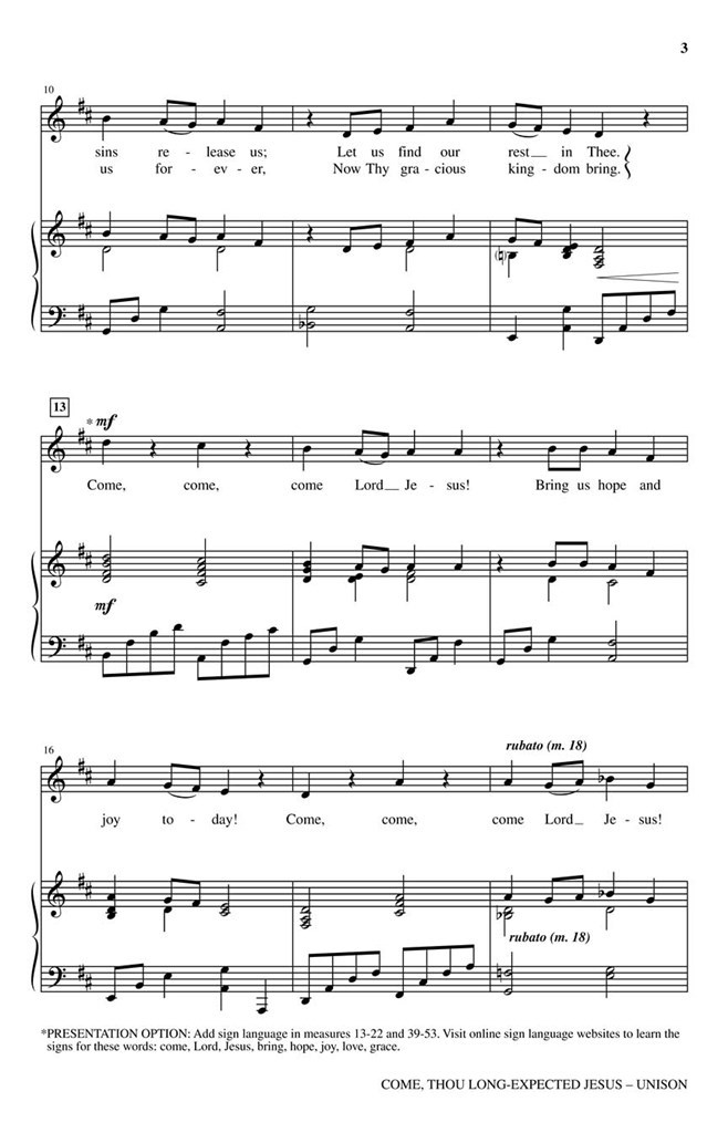 De nouvelles paroles et une jolie nouvelle mélodie s’associent au texte de l’Avent adoré de Charles Wesley dans cet hymne émouvant pour enfants, jeunes ou chœurs d’adultes. Le refrain simple intègre une langue des signes optionnelle qui met l’accent sur les mots-clés et offre de magnifiques images visuales au message de la chanson sur le désir que Christ viendra. Disponible séparément : Unison, CD CelebrationTrax. Durée : environ 3:00 ScorePlay - cliquez pour voir le score avec enregistrement.