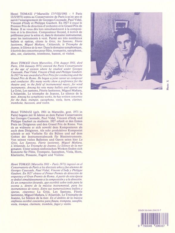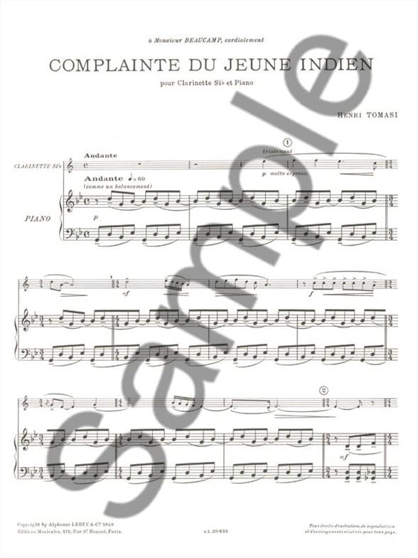 Composed in 1949 by Henri Tomasi, Complainte Du Jeune Indien is a piece for Clarinet and Piano accompaniment. This piece voices the lament of a young Indian, expressing nostalgia. It is quite sad with an Andante tempo and the harmonic motion is quite slow. Two cadenzas feature in this work, with the possibility to cut them out to make rehearsals easier. The piece finishes sadly on the main theme which is played on last time. Written for intermediate, Complainte Du Jeune Indien player can be used as a contest piece or for a recital. Henri Tomasi also composed'Corsica Songs' and 'Five Profaning and Holy Songs' for Clarinet and Piano.