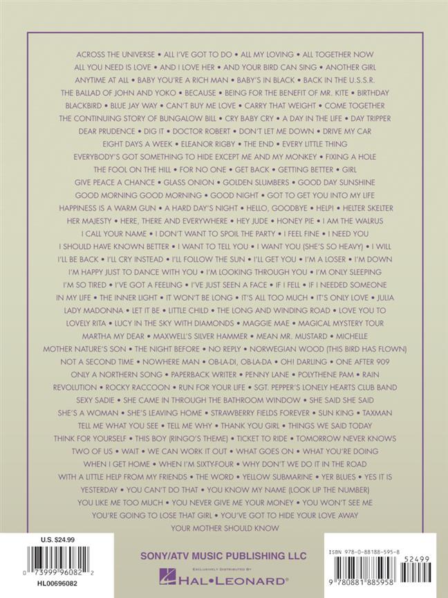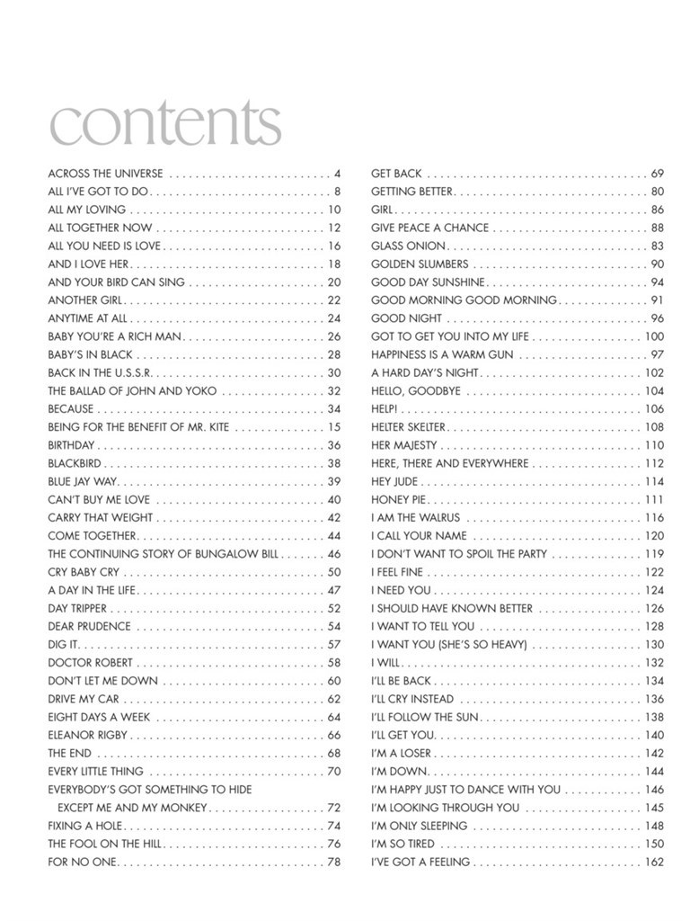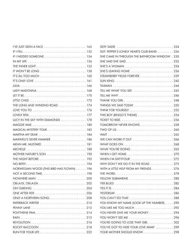 Retrouvez les 155 chansons enregistrées par les Beatles en transcriptions paroles complètes et diagrammes d'accords guitare. Titres : A Day In The Life - A Hard Days Night - Across The Universe - All I've Got To Do - All My Loving - All Together Now - All You Need Is Love - And I Love Her - And Your Bird Can Sing - Another Day - Another Girl - Anytime At All - Baby You're A Rich Man - Baby's In Black - Back In The Ussr - Ballad Of John And Yoko - Because - Being For The Benefit Of Mr Kite - Birthday - Blackbird - Blue Jay Way - Can't Buy Me Love - Carry That Weight - Come Together - Continuing Story Of Bungalow Bill - Cry Baby Cry - Day Tripper - Dear Prudence - Dig A Pony - Don't Let Me Down - Dr Robert - Drive My Car - Eight Days A Week - Eleanor Rigby - End (The) - Every Little Thing - Everybody's Got Something To Hide Except Me And My Monkey - Fixing A Hole - Flying - For No One - From A Window - From Me To You - Get Back - Getting Better - Girl - Give Peace A Chance - Glass Onion - Golden Slumbers - Good Day Sunshine - Good Morning Good Morning - Goodbye - Goodnight - Got To Get You Into My Life - Happiness Is A Warm Gun - Hello Goodbye - Hello Little Girl - Help! - Helter Skelter - Her Majesty - Here There And Everywhere - Hey Bulldog - Hey Jude - Hold Me Tight - Honey Pie - I Am The Walrus - I Call Your Name - I Don't Want To See You Again - I Don't Want To Spoil The Party - I Feel Fine - I Need You - I Saw Her Standing There - I Should Have Known Better - I Wanna Be Your Man - I Want To Hold Your Hand - I Want To Tell You - I Want You (She's So Heavy) - I Will - If I Fell - If I Needed Someone - I'll Be Back - I'll Cry Instead - I'll Follow The Sun - I'll Get You - I'm A Loser - I'm Down - I'm Happy Just To Dance With You -I'm Just In Love -I'm Looking Through You -I'm Only Sleeping -I'm So Tired -In My Life -Inner Light -It Won't Be Long -It's All Too Much -It's For You -It's Only Love -I've Got A Feeling -I've Just Seen A Face -Julia -Lady Madonna -Let It Be -Like Dreamers Do -Little Child -Love Of The Loved -Love You To -Lovely Rita -Lucy In The Sky With Diamonds -Magical Mystery Tour -Martha My Dear -Maxwell's Silver Hammer -Mean Mr Mustard -Michelle -Misery -Mother Natures Son -Night Before -No Reply -Nobody I Know -Norwegian Wood -Not A Second Time -Nowhere Man -Ob-la-di, Ob-la-da -Oh! Darling -One After 909 -Only A Northern Song -Paperback Writer -Penny Lane -Polythene Pam -Power To The People -Rain -Revolution -Rocky Raccoon -Run For Your Life -Sexy Sady -Sgt. Pepper's Lonely Hearts Club Band -She Came In Through The Bathroom Window -She Loves You -She Said She Said -She's A Woman -She's Leaving Home -Step Inside Love -Strawberry Fields For Ever -Strawberry Fields Forever -Sun King -Taxman -Tell Me What You See -Tell Me Why -Thank You Girl -The Fool On The Hill -There's A Place -Things We Said Today -Think For Yourself -This Boy (Ringo's Theme) -Ticket To Ride -Tip Of My Tongue -Tomorrow Never Knows -Two Of Us -Wait -We Can Work It Out -What Goes On -What You're Doing -When I Get Home -When I'm Sixty Four -With A Little Help From My Friends -Within You Without You -Word -World Without Love -Yellow Submarine -Yer Blues -Yes It Is -Yesterday -You Can't Do That -You Like Me Too Much -You Never Give Me Your Money -You Won't See Me -Your Mother Should Know -You're Going To Lose That Girl -You've Got To Hide Your Love Away