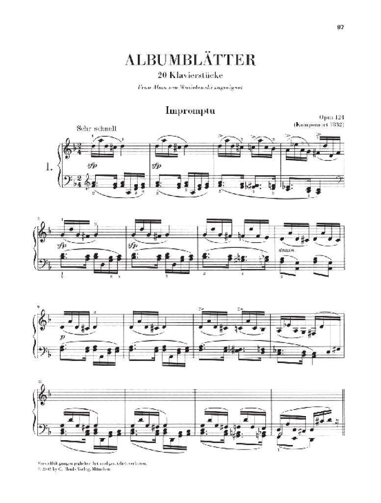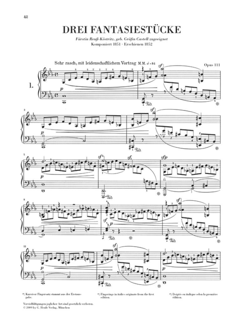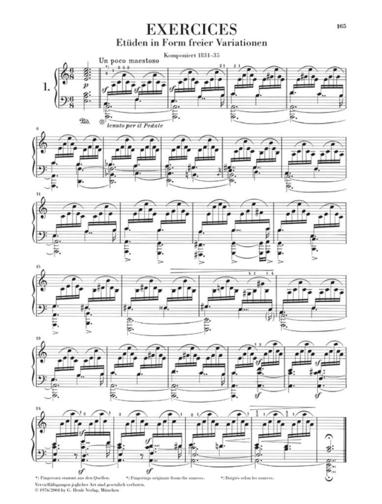 À l’occasion du 200é anniversaire de la naissance de Robert Schumann en 2010, un projet dédition ambitieux a été conlcu: pour la première fois après l’édition par Clara Schumann des oeuvres complètes de Schumann en 1879–93, toutes les oeuvres pourpiano solo sont publiées dans le cadre dune même édition. Pendant près de dix ans de travail minutieux, tous les titres de Schumann déjà publiés aux Éditions G. Henle ont été soumis à une révision détaillée. Ernst Herttrich, spécialiste de Schumann, avait passé chaque édition au banc d’essai, se consacrant aussi aux oeuvres jusqu’ici absentes de notre catalogue. La présente collection comprenant six volumes est disponible en version brochéeou reliée et dans la série «Studien-Edition» en coffret. Classée de façon explicite selon les numéros d’opus, cette publication regroupe non seulement toutes les oeuvres pour piano de Schumann conformes à l’état actuel de la recherche, mais elle renferme aussi des textes d’accompagnement informatifs, desversions alternatives et bien d’autres choses. Contenu: Exercises - Etüden in Form freier Variationen über ein Thema von Beethoven- Variationen über ein eigenes Thema in Es [Geistervariationen] Es-dur - Drei Fantasiestücke op. 111- DreiKlaviersonaten für die Jugend op. 118- Albumblätter op. 124- Sieben Klavierstücke in Fughettenform op. 126- Gesänge der Frühe op. 133 - "Einsame Blume" aus Waldszenen op. 82- Bunte Blätter op. 99