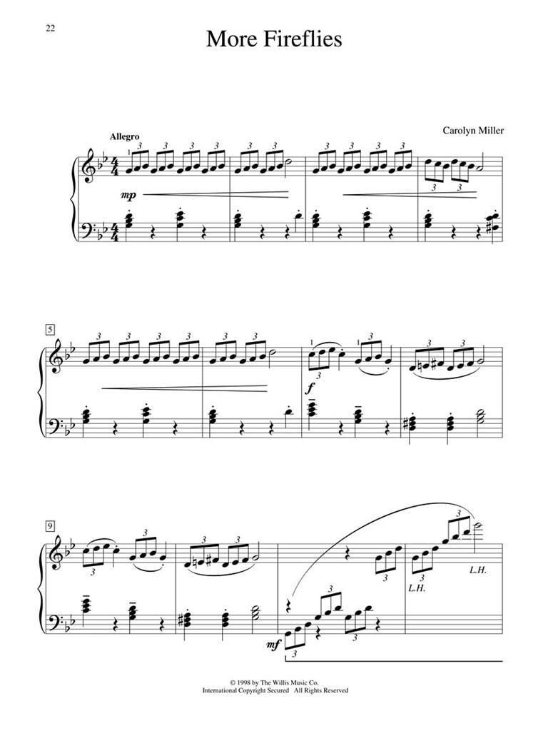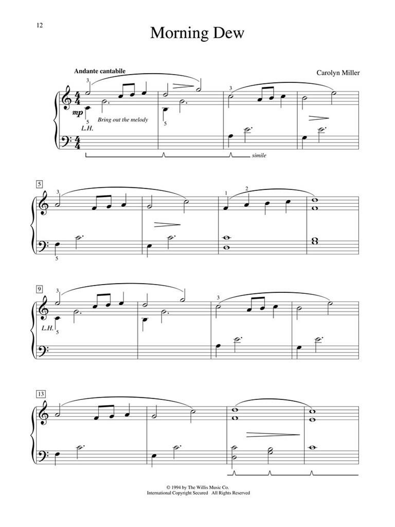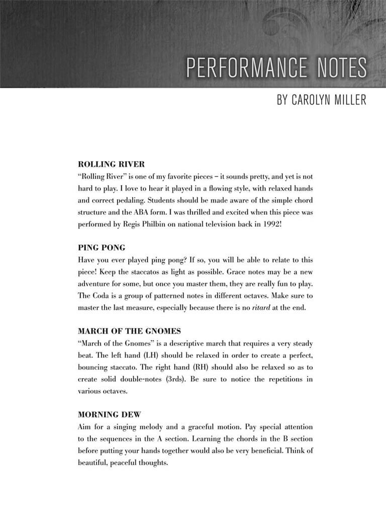 Huit excellentes œuvres de Carolyn Miller ! Comprend six des pièces élémentaires préférées de Miller, ainsi que deux compositions toutes nouvelles. Titres : La piscine aux poissons rouges · Marche des Gnomes · Plus de lucioles · Rosée du matin · Ping-pong · La Danse du Flûte · Razz-a-ma-tazz · Rivière Roulante.