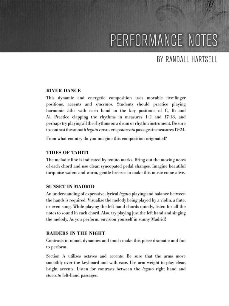 Huit excellentes œuvres de Randall Hartsell ! Cette collection présente six des pièces préférées de Hartsell ces dernières années, ainsi que deux toutes nouvelles composées spécialement pour cette série. Titres : Au-dessus des nuages · AutumnReverie · Pillards dans la nuit · Danse de la Rivière · Averses à l’aube · Rayons de soleil sous la pluie · Coucher de soleil à Madrid · Marées de Tahiti. Inclut des notes de performance.
