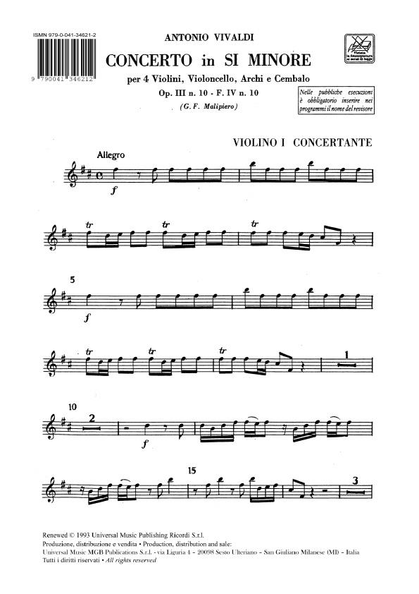 Conc. Per Vl. E Vc. Solisti, Archi E B.C.: Per 4 Vl. E 1 Vc. In Si Min. Op. III N.10 – Rv 580 – F.IV/10 VIVALDI ANTONIO