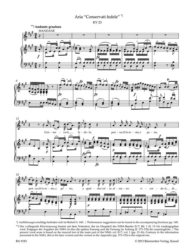 This vocal score of Mozart ’s concert and insert arias is based on the New Mozart Edition (NMA). The musical text presented in this edition is free from practical references on performance aspects or suggestions on performance practice. An accompanying booklet gives detailed explanations on the execution of appoggiaturas and other performance practice phenomena relevant to each aria. In addition, there is a choice of suggestions for the performance of cadenzas and lead-ins as well as for the ornamentation of dal segno parts, which are often found in the early Mozart arias. All aria texts translated into German and English and printedseparately. Contents: Concert Arias III for Low Soprano and Alto Aria “Conservati fedele”, K. 23 Aria “Cara, se le mie pene”, K. 6: deest Aria “Alma grande e nobil core”, K. 578 Aria “Chi sà, chi sà, qual sia”, K. 582 Aria “Vado, ma dove? oh Dei!”, K. 583 Recitativo “Ombra felice” – “Aria Io ti lascio”, K. 255