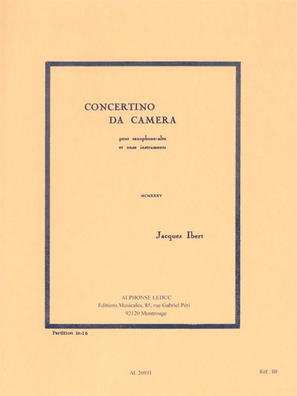 Concertino Da Camera, written in 1935 by Jacques Ibert (1890-1962) is a small concerto for Alto Saxophone and eleven instruments: Flute, Bassoon, Oboe, Horn, Trumpet and Strings. This concertino in two movements, Allegro con moto and Larghetto & Animato Molto, is dedicated to the saxophonist Sigurd Rascher and stands out for its large use of the Alto Saxophone. It can be technically challenging and has a strong lyrical part. This volume is the pocket version of the score. Its author, Jacques Ibert (1890-1962) is a neoclassical composer who won the Prix de Rome in 1919. He composed many symphonicsuites, operas and seven orchestras, including 'Angelique' (1926) and 'Divertissement' (1930). He also was in charge of the Accademie de France in the Villa Medicis (Roma) and was later administrator for the Paris Opera. This concerto has some similarities with is Flute Concerto (1934), also published by Alphonse Leduc.
