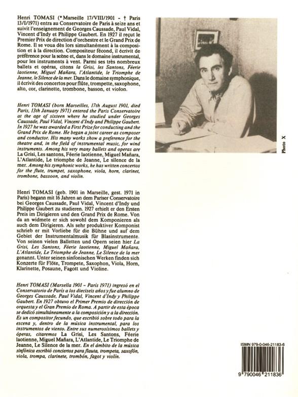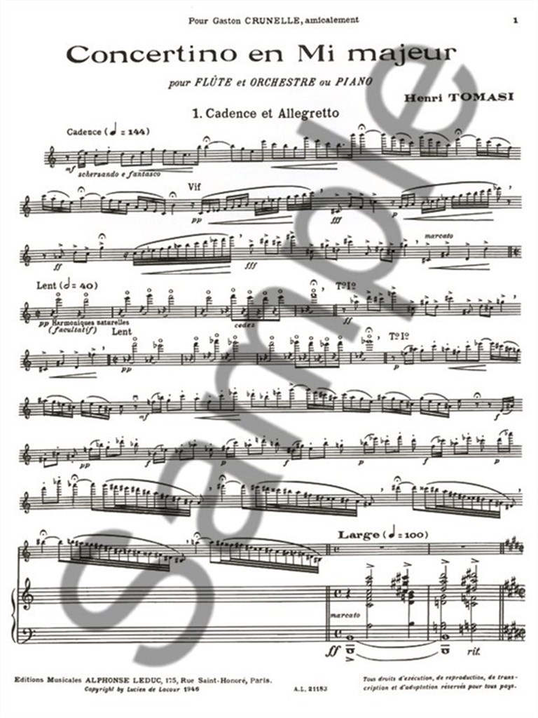 Le compositeur et chef d’orchestre français Henri Tomasi (1901-1971) a publié le Concertino pour flûte en 1946. Comme pour ses autres œuvres à vent, Concertino fut bien accueilli par le public. Tomasi est né à Marseille, mais son père et sa mère étaient originaires de La Casinca en Corse. Malgré la pression de ses parents pour étudier la musique, Tomasi rêvait de devenir marin et, durant l’été, il séjourna chez sa grand-mère en Corse où il apprit des chansons traditionnelles corse. Cependant, en 1921, il commença ses études au Conservatoire de Paris et devint un compositeur et chef d’orchestre de renom. Tomasi n’oubliait pas ses parcours corse, incorporant souvent des thèmes des chansons qu’il avait apprises durant les étés avec sa grand-mère dans ses compositions. Concertino pour flûte et réduction pour piano est une œuvre très inhabituelle et moderne en trois mouvements ; 1) Cadence et Allegretto, 2) Largo, et 3) Finale. Cette pièce Tomasi convient aux flûtistes avancés, offrant un ajout alternatif et passionnant au répertoire de l’instrument.