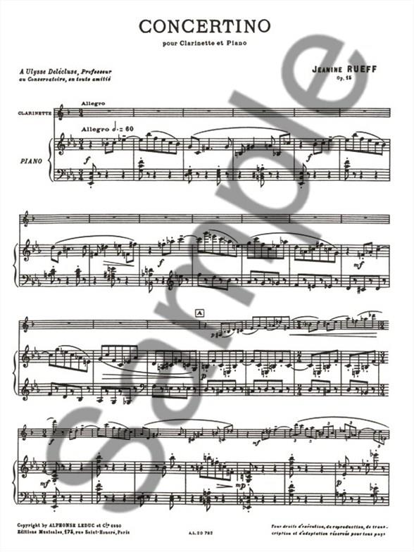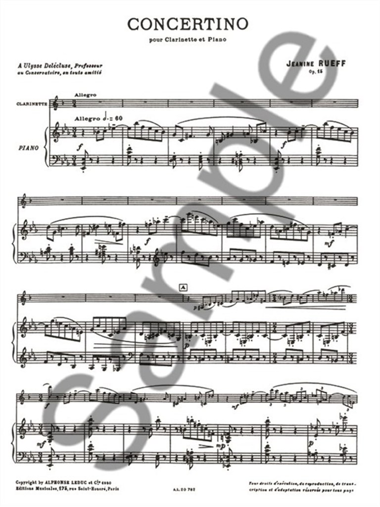 Jeanine Rueff (1922-1999) was a French composer and music educator. Her Concertino for Clarinet and orchestral or Piano accompaniment was first published in 1950 and remains a popular, alternative piece in the advanced clarinetist's performance repertoire. Rueff wrote extensively for the Saxophone and Clarinet and her compositions are often used as required contest solos. Concertino is fast and contains complex rhythms. Other appealing musical features include chromaticism, triplet motifs and the exploitation of the entire range of the Clarinet. Rueff 's Concertino provides a challengingyet riveting piece for advanced clarinetists.
