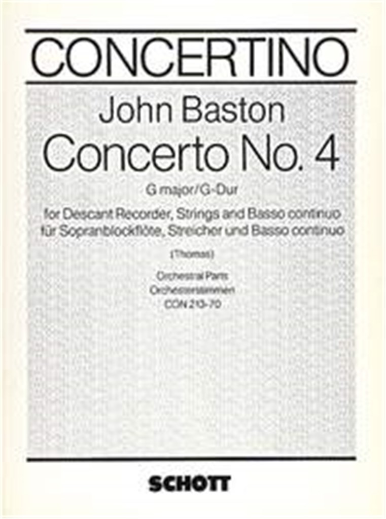 Avec ces nouvelles éditions, tous les concertos de six enregistreur de John Baston sont maintenant disponibles, chacune avec un score, score de piano et de pièces. Le thor-oughly édité scores suivre essentiellement la première édition imprimée par John Walsh à Londres en 1729. Baston était considéré comme un excellent enregistreur et le joueur de flûte qui a travaillé avec des orchestres d'opera de Londres au début du XVIIIe siècle. Ses concertos faciles, anticipant la mélodie élégante de début de la période classique jouissent de grande popularité qui représente une tâche enrichissante pour les orchestres de l'école de musique et les joueurs de l'enregistreur avancé.