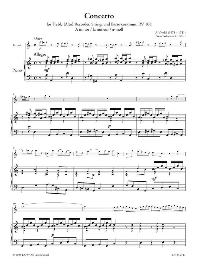 Le niveau technique de ce concerto pour flûte à bec alto, cordes et basse continue RV 108 en La mineur d’Antonio Vivaldi est moins élevé que les concertos pour flûte à bec piccolo. Néanmoins, il est très plaisant jouer un vrai Vivaldi. Les enregistrements de démonstration et des accompagnements sont disponibles en ligne au format MP3.