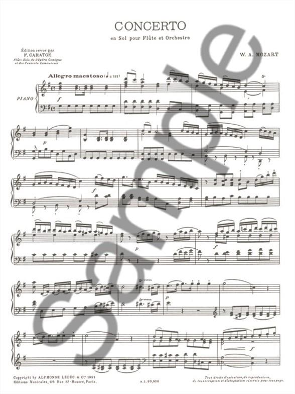 Wolfgang Amadeus Mozart 's (1756-1791) Flute Concerto in G was written by the composer in 1778. The Concerto remains widely studied and performed on the Flute, making it one of the most important Concerti in the instrument's repertoire. Concerto in G is in three movements; 1. Allegro maestoso, 2. Adagio ma non troppo, and 3. Rondo: Tempo di Menuetto. The first and last movements are in the tonic key, whilst the second movement is in the subdominant key of D major. A Dutch flautist of the time, Ferdinand de Jean, commissioned Mozart for four Flute quartets and three Flute concerti. However, thecomposer, who famously disliked the Flute, only completed three quartets and two concertos. Instead of composing a second concerto, Mozart rearranged his Oboe Concerto, with substantial changes for it to fit with the Flute. This edition of Mozart 's Concerto in G includes cadences by virtuosos Taffanel, Gaubert and Bozza, making for an unmissable version of the famed work.
