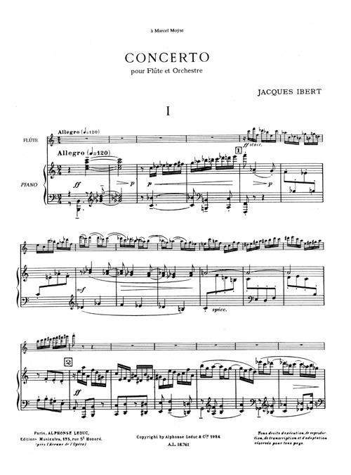 Published in 1934, this is one of the most frequently interpreted flute concertos, by Jacques Ibert (1890-1962), a neoclassical composer who won the Prix de Rome in 1919. Written for the French flautist Marcel Moyse, it is rated as difficult and is composed of three movements: Allegro, Andante and Allegro Scherzando. The first, Allegro, is challenging with a rapid suite of sixteen notes followed by a theme more lyrical. Andante, the second movement, is lyrical and recalls its suites Escales (1924). Finally, Allegro Scherzando reminds us of French drama through its theatricality and can be difficult for the soloist due to itsrhythmic part. Jacques Ibert (1890-1962) also composed many symphonic suites, operas and seven orchestras, including Angelique (1926) and Divertissement (1930). He also was in charge of the Accademie de France in the Villa Medicis (Roma) and was later administrator for the Paris Opera.