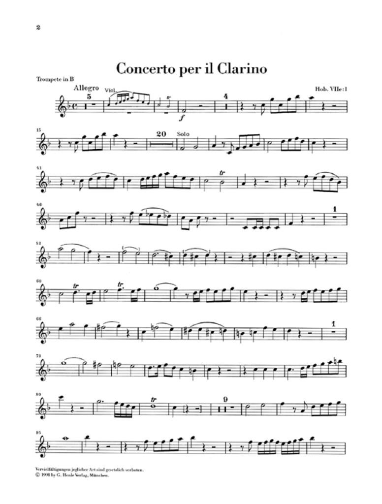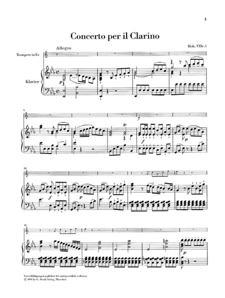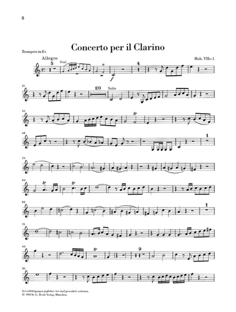 À la fin du 18e siècle, Anton Weidinger (1767–1852), trompettiste à la cour de Vienne, mit au point une «trompette à clés» permettant d’exécuter des chromatismes à la trompette, c’est- à-dire de traverser l’octave par paliers d’un demi-ton. Ainsi en 1796, Joseph Haydn composa-t-il spécifiquement pour Weidinger le concerto pour trompette en mi bémol majeur Hob. VIIe:1 qui compte aujourd’hui parmi les oeuvres majeures du répertoire concertant de cet instrument. Les contemporains qualifiaient le timbre de cette trompette à clés de doux et délicat. Peut-être est-ce la raison pour laquelle, dans ce concerto, Haydn a davantage placé l’accent sur le lyrisme des thèmes que sur labrillance des sonorités. Et c’est pourquoi la trompette en si bémol ou éventuellement le bugle sont un meilleur choix qu’une trompette en mi bémol majeur pour les exécutions actuelles. La partition de cette édition se fonde sur celle de l’édition complète des oeuvres de Haydn également parue aux éditions G. Henle.