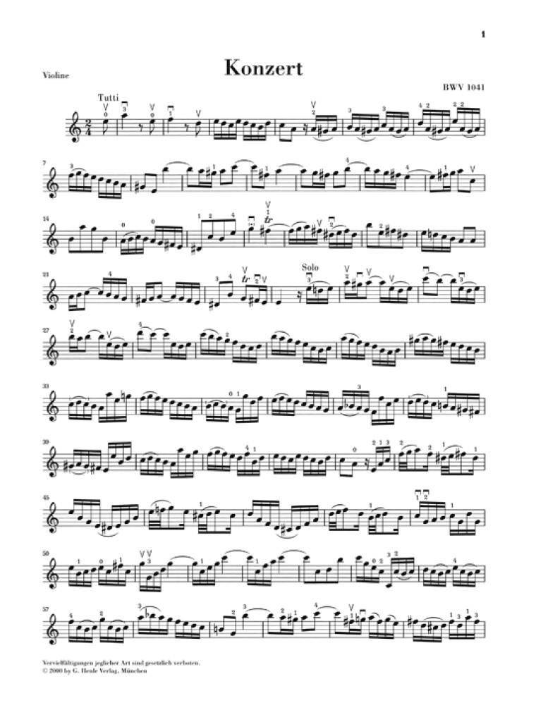 Le concerto pour violon en La mineur BWV 1041 de Bach ne pose guère de problème éditorial: il existe des parties séparées originales soigneusement écrites datant du temps de Köthen (ou des premières années de Leipzig). Outre l’assurance d’un texte musical sûr, l’édition Henle se distingue aussi par sa fonctionnalité: grâce à une partie de solo dépliante les tournes sont aisées, ce qui, au regard du véritable déluge de doubles croches du premier mouvement, était à soi seul un défi – procédé que d’autres maisons d’édition ont depuis lors adopté. Mais seule la réduction pour piano de l’édition Henle – pour tous les trois concertos pour violon de Bach – est déchiffrable àvue, et sans peine, même par des amateurs.