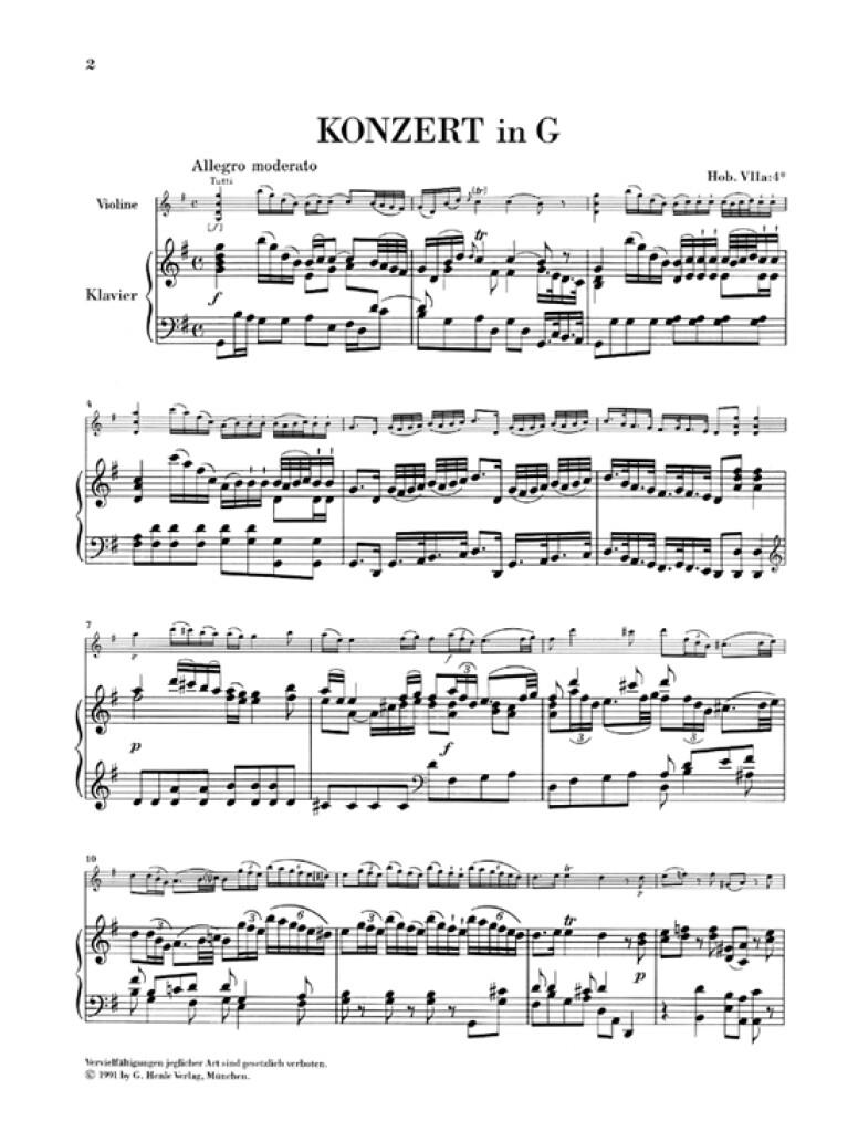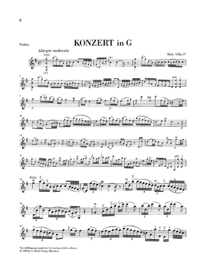 Trois concertos pour violon de Joseph Haydn ont été conservés dont deux, le concerto en ut majeur et celui en la majeur ont été composés à la cour du prince Esterházy. Quant au concerto pour violon en sol majeur Hob. VIIa:4, Haydn l’écrivit probablement au début des années 1760 avant d’entrer au service du prince. Aussi n’est-il pas surprenant qu’il se distingue nettement des deux autres. La partie soliste du violon ne s’aventure quasiment jamais au-delà de la troisième position et l’oeuvre se concentre davantage sur la musicalité que sur la virtuosité. Cette oeuvre offre ainsi aux (jeunes) élèves violonistes une bonne occasion d’aborder les oeuvres de Joseph Haydn pour la premièrefois. L’édition urtext se fonde sur l’édition complète des oeuvres de Haydn également parue aux éditions G. Henle. La préface détaillée aborde notamment la question de l’authenticité de l’oeuvre. L’édition est complétée de coups d’archet et de doigtés soigneusement élaborés par Kurt Guntner ainsi que des cadences réalisées par Kurt Beyer.