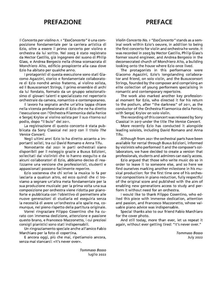 Ezio Bosso’s Violin Concerto No. 1 “EsoConcerto”, published here in a violin and piano reduction, is considered one of the seminal compositions of his artistic career as well as being the first concerto he ever wrote for violin and orchestra. The work also marked another key stage in Ezio’s professional career, when he conducted the Orchestra Filarmonica della Fenice himself at the occasion of his return to the podium after “the darkness” of 2011.