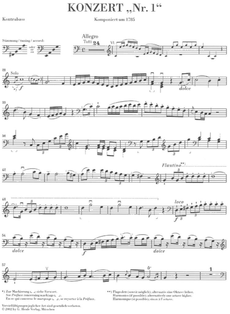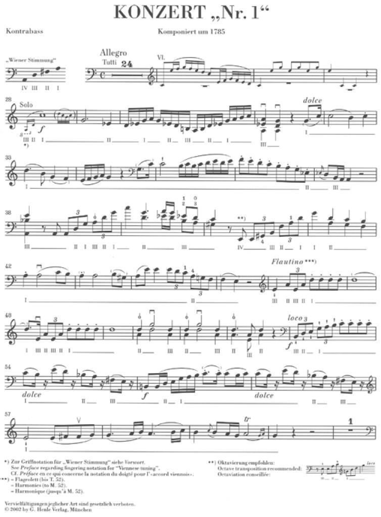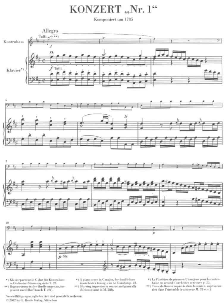 Ce concerto est devenu, en raison de sa richesse d'invention, de la qualité de sa technique d'écriture ainsi que de ses exigences sur les plans technique et musical, l‘une des oeuvres fréquemment requises pour les concours. L'édition répond tous les désirs : la partie de contrebasse est donnée pour l'instrument avec accord de solo et d'orchestre, avec réduction pour piano en Ré majeur et en Ut majeur. En outre, une deuxième partie en «notation par doigtés», spécialement conçue en fonction de l'«accord viennois» en usage l'époque de Hoffmeister, permet l'instrumentiste de jouer directement, sans réapprentissage fastidieux, selon l'accord historique. ?