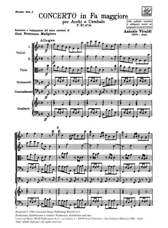 Concerto Per Archi E B.C.: In Fa Rv 138 – F.Xi/34 Tomo 288 VIVALDI ANTONIO