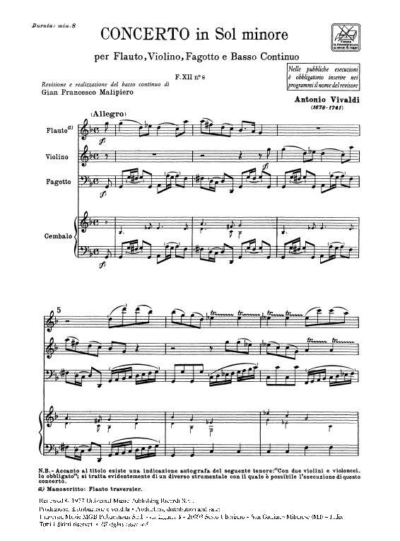 Concerto Per Str. Diversi E B.C.: In Sol Min Per Fl. Vl. E Fg. Rv 106 – F.XII/8 Tomo 41 VIVALDI ANTONIO