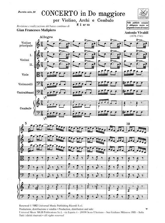 Concerto Per Vl., Archi E B.C.: In Do Rv 171 – F.I/93 Tomo 194 VIVALDI ANTONIO