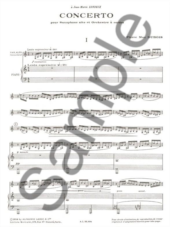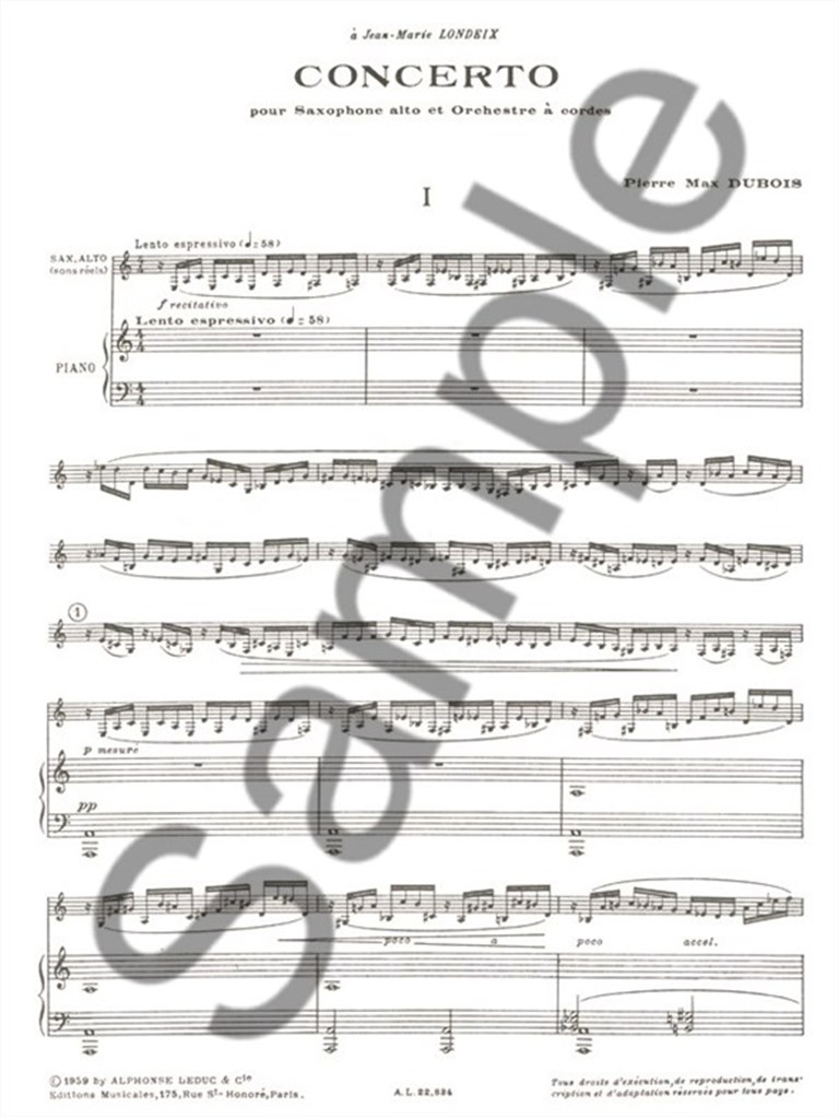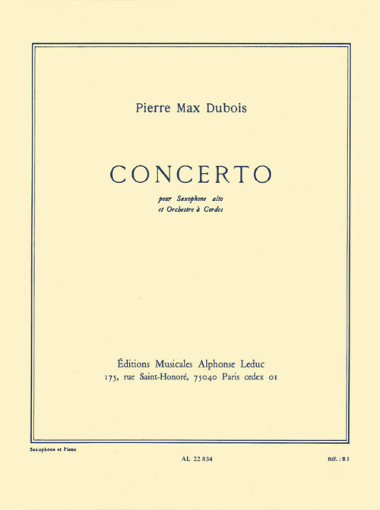 Concerto by Pierre Max Dubois is a piece of 18 minutes initially composed for an Alto Saxophone and a String Orchestra. These scores are for Saxophone and Piano. The Saxophone part is considered as difficult and requires a strong endurance and good technique. This Concerto is divided into three distinct movements: 1. Lento, Cadenza e Allegro 2. Sarabande 3. Rondo Really interesting to play, it is a great piece for recitals and contests. Pierre Max Dubois (1930-1995) is a French composer who was awarded the Prix de Rome in 1955. Mainly composing classical music, hisworks are mainly for woodwinds. He is one of the founder of the Les Six which included his professor, Darius Milhaud.