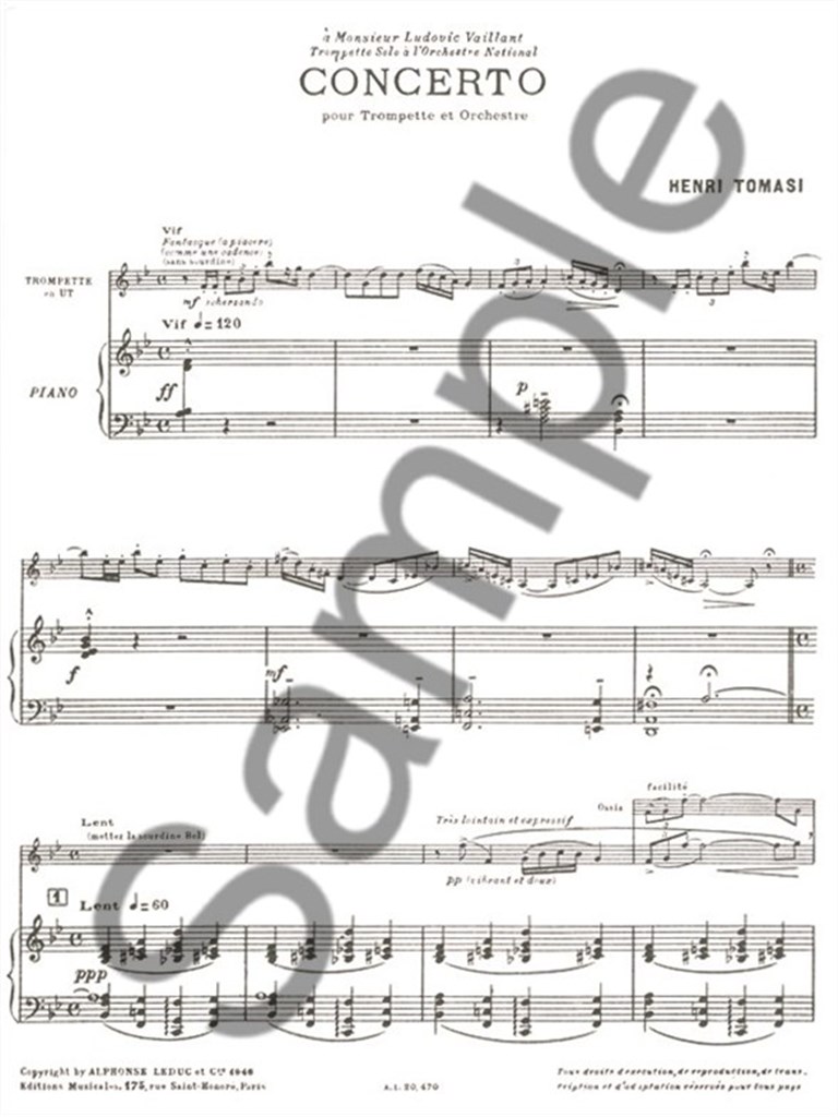 Finished in 1948, the Concerto for Trumpet and Orchestra was composed by the French composer, conductor and the 1927 winner of the Grand Prix de Rome, Henri Tomasi (1901-1971), and lasts approximately 14 minutes. Dedicated to the Trumpeter Ludovic Vaillant, soloist at the National Orchestra, the Concerto for Trumpet and Orchestra was premiered in Paris in 1949. The first part, which lasts 7 minutes, Allegro and Cadenza, begins with a trumpet cadenza and a quiet snare drum background. The Nocturne follows as the second part of this Concerto, and the Finale, the shortest part of the concerto, ends up with acheerful cartoon-music theme. Henri Tomasi also composed a variety of concerti for Alto Saxophone and for Trombone, as well as some ballades.