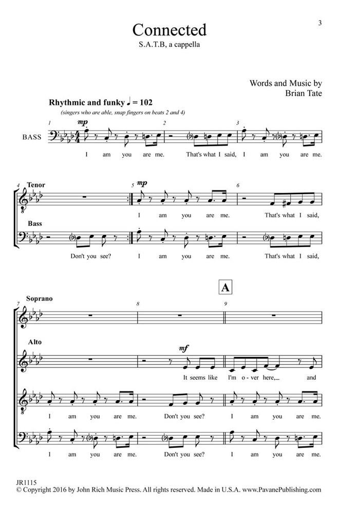 Brian Tate wants to help bring us all together and uses his imaginative music and community-building texts to make it happen. Each vocal part gets its own statement and they sequence together into a rollicking chorus, all a cappella, all fun. High school, community, even college choirs can find a joyful spot to program this number. Easy.