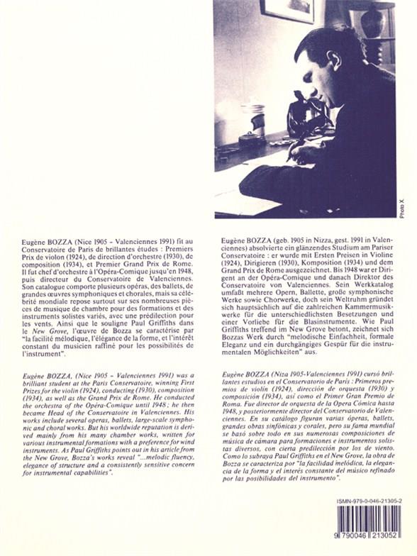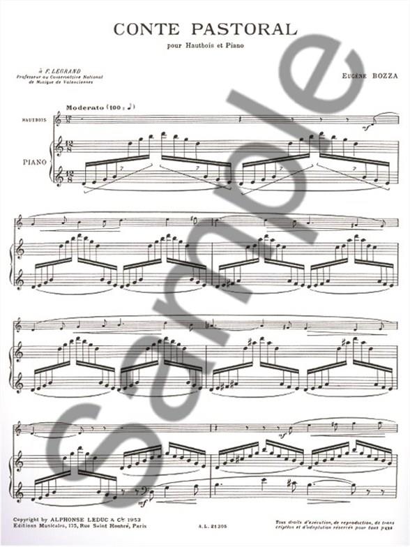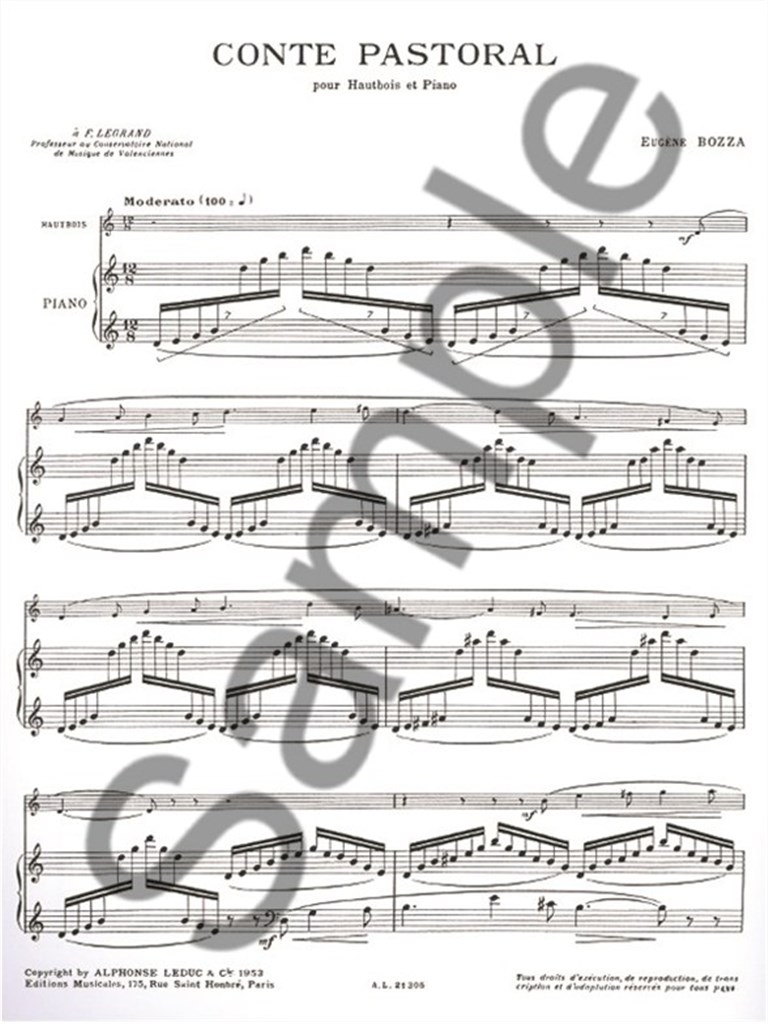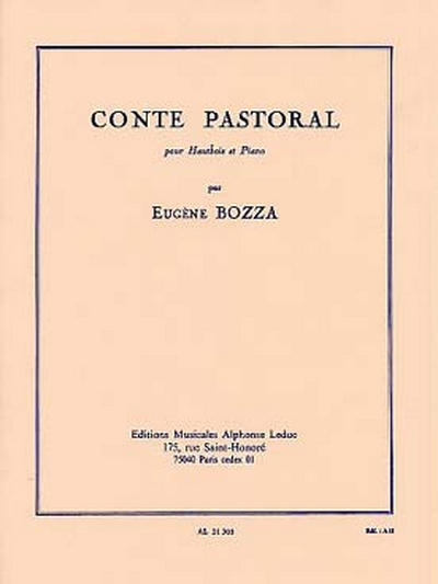 Conte Pastorale is a piece for Oboe and Piano accompaniment by Eugène Bozza. Dedicated to F. Legrand, a professor at the Valenciennes Conservatoire, this work is quite difficult and would be ideal for upper intermediate/advanced players. It is divided in three parts: 1. Moderato 2. Andantino 3. Allegro - Scherzando This volume features the score and parts. It is a really nice for concerts and recitals. Eugène Bozza won different prizes at the Conservatoire de Paris such as the First Prizes for the Violin, conducting and composition, as well as the Grand Prix de Rome. Hecomposed several operas, chamber works and ballets among others.