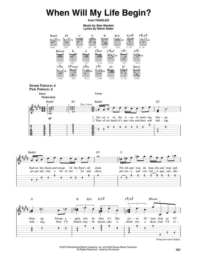 This collection includes 30 fun Disney hits arranged in notes and tab for beginning guitarists to enjoy. Contemporary Disney includes the songs Almost There, Be Our Guest, Beauty and the Beast, Can You Feel the Love Tonight, Colors of the Wind, For the First Time in Forever, Friend like Me, Hakuna Matata, I See the Light, Lava, Let It Go, Reflection, Touch the Sky, When Will My Life Begin?, True Love's Kiss, A Whole New World, Under the Sea, You Are the Music in Me, We're All in This Together and more.