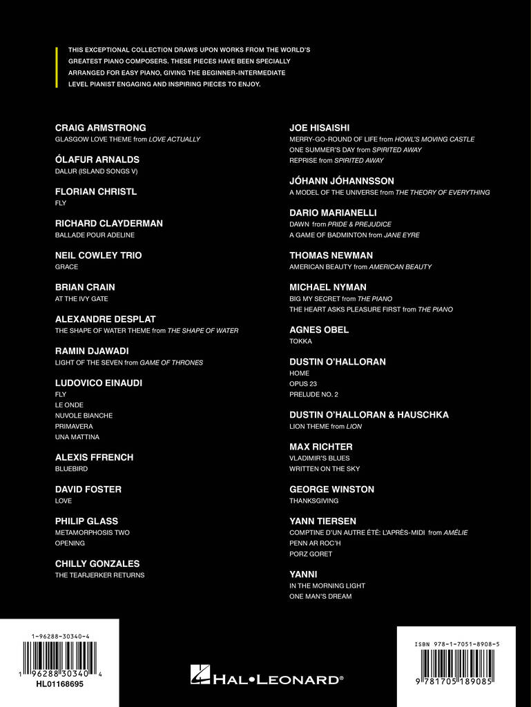 This exceptional collection draws upon works from the world’s greatest piano composers. These pieces have been specially arranged for easy piano, giving the beginner-intermediate level pianist engaging and inspiring pieces to enjoy. Includes beautiful pieces by Ludovico Einaudi, Alexis Ffrench, Dustin O’Halloran, Joe Hisaishi, Yann Tiersen and may more!