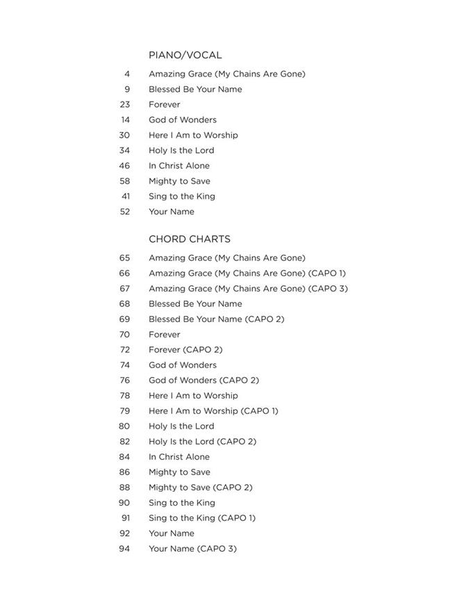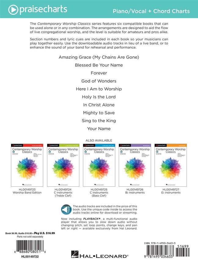 The Contemporary Worship Classics series features six compatible books that can be used alone or in any combination. The arrangements are designed to aid the flow of live congregational worship, and the level is suitable for amateurs and pros alike. Section numbers and lyric cues are included in each book so musicians can play together easily. Use the downloadable audio tracks in lieu of a live band, or to enhance the sound of your band for rehearsal and performance. 10 songs: Amazing Grace (My Chains Are Gone) - Blessed Be Your Name - Forever - God of Wonders - Here I Am to Worship (Light of the World) - Holy Is the Lord - In Christ Alone - Mighty to Save - Sing to the King - Your Name.