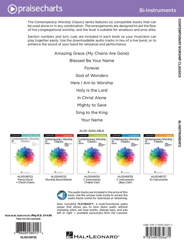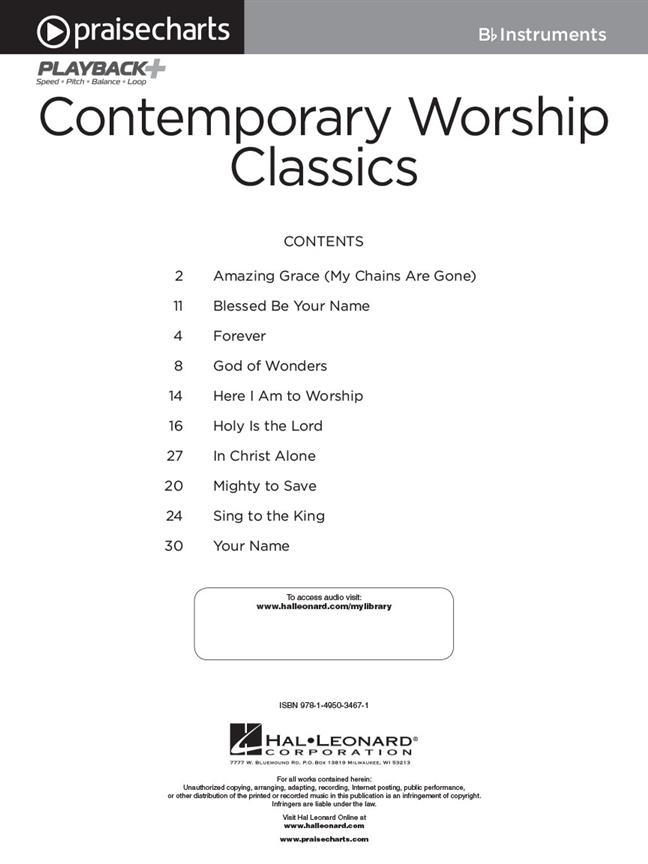 The Contemporary Worship Classics series features six compatible books that can be used alone or in any combination. The arrangements are designed to aid the flow of live congregational worship, and the level is suitable for amateurs and pros alike. Section numbers and lyric cues are included in each book so musicians can play together easily. Use the downloadable audio tracks in lieu of a live band, or to enhance the sound of your band for rehearsal and performance. 10 songs: Amazing Grace (My Chains Are Gone) - Blessed Be Your Name - Forever - God of Wonders - Here I Am to Worship (Light of the World) - Holy Is the Lord - In Christ Alone - Mighty to Save - Sing to the King - Your Name.