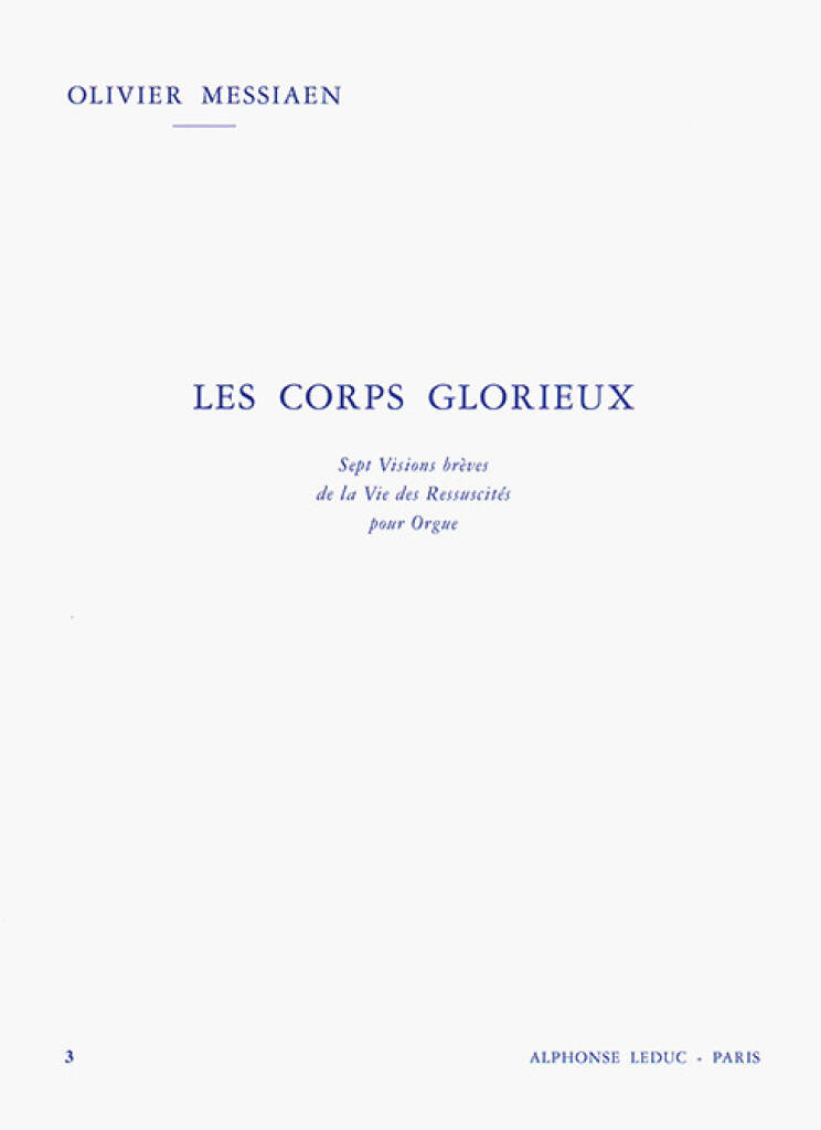 Les Corps Glorieux, d’Olivier Messiaen, est une composition qui illustre sa foi catholique romaine. Écrit pour orgue en 1939, il est un mélange de musique indienne et de plain grégorien. Ce troisième volume comprend les trois dernières pièces de l’ensemble de la composition : 5. Force et agilité des Corps Glorieux, 6. Joie et clarte des Corps Glorieux et 7. Le Mystère de la Sainte-Trinite. Cette pièce est divisée en 7 sections : 1. Subtilité des Corps Glorieux 2. Les eaux de la Grâce 3. L’ange aux parfums 4. Combat de Mort et de la Vie 5. Force et agilité du Corps Glorieux 6. Joie et clarte des Corps Glorieux 7. Le Mystère de la Sainte-Trinite Olivier Messiaen (1908-1992) était un organiste et compositeur français passionné d’ornithologie et l’un des compositeurs les plus importants de son siècle. Inspiré par la musique japonaise, il avait une manière très particulière de composer, et son œuvre se distingue par sa complexité, son aspect diatonique, son harmonie avec des transpositions limitées, sa couleur et ses rythmes additifs. Il composa de nombreuses œuvres liées à l’ornithologie et au chant des oiseaux, dont le « Bird Catalogue » en 7 volumes et le « Treatise on rhythm, colour and ornithology » en 7 volumes.