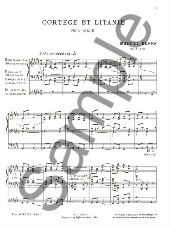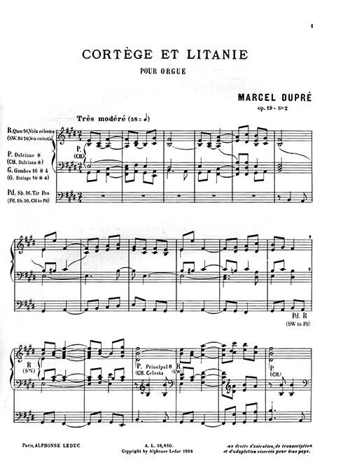 This version of Cortè ge Et Litanie by Marcel Dupre was written for Organ. For upper intermediate players, these 8 page composition is written with 4 sharps and includes the use of the pedals. The piece, initially written for a small orchestra in 1922, was created for a play. Dupre integrated it into one of his Piano recitals and was later asked to arrange it for other instruments. These scores therefore exist also arranged for Piano, Orchestra (in 4 and 16) and for the conductor. In terms of composition, the piece is divided into two: Cortège, which titledescribes a solemn procession, begins in E major and lasts twice as long as the introductory theme; and Litanie, which is describing the prayer sung during a procession and which follows the Cortège part to then be joined by it. Marcel Dupre is a French composer and virtuoso organist who won the Prix de Rome in 1914. He became famous when he played the work of Bach in its totality from memory in 1920. He later became the professor of many renowned students at the Paris Conservatoire such as Messiaen, Langlais and Cochereau among others.