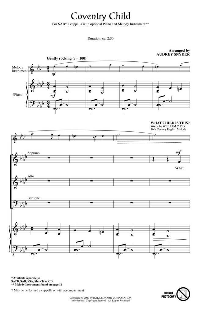 Deux mélodies de Noël précieuses sont habilement associées dans ce contexte : What Child Is This et The Coventry Carol. Interprétez-la a cappella ou accompagnée de piano, de basse en option et d’instrument mélodique ou guitare obbligato. Disponibles séparément : SATB, SAB, SSA, ShowTrax CD. Durée : environ 2h30.