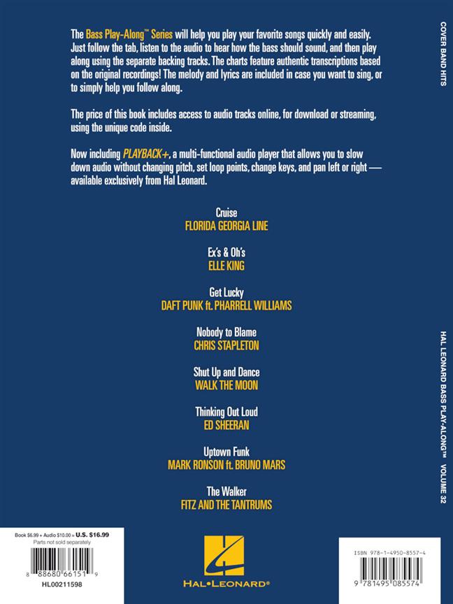 The Bass Play-Along series will help you play your favorite songs quickly and easily! Just follow the tab, listen to the online audio to hear how the bass should sound, and then play along using the separate backing tracks. The melody and lyrics are included in the book in case you want to sing, or to simply help you follow along. The online audio is available for streaming or download using the unique access code printed inside the cover. This pack includes: Cruise - Ex's and Oh's - Get Lucky - Nobody to Blame - Shut up and Dance - Thinking Out Loud - Uptown Funk - The Walker.