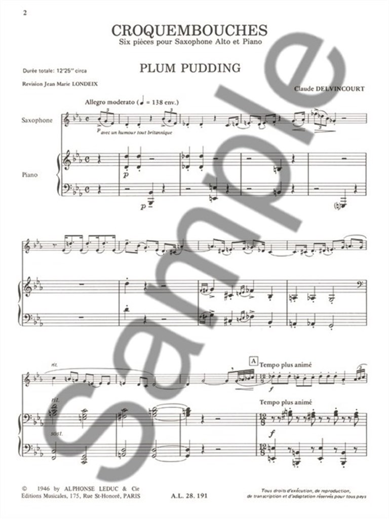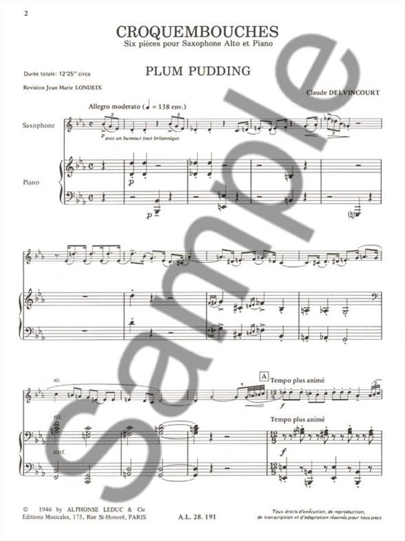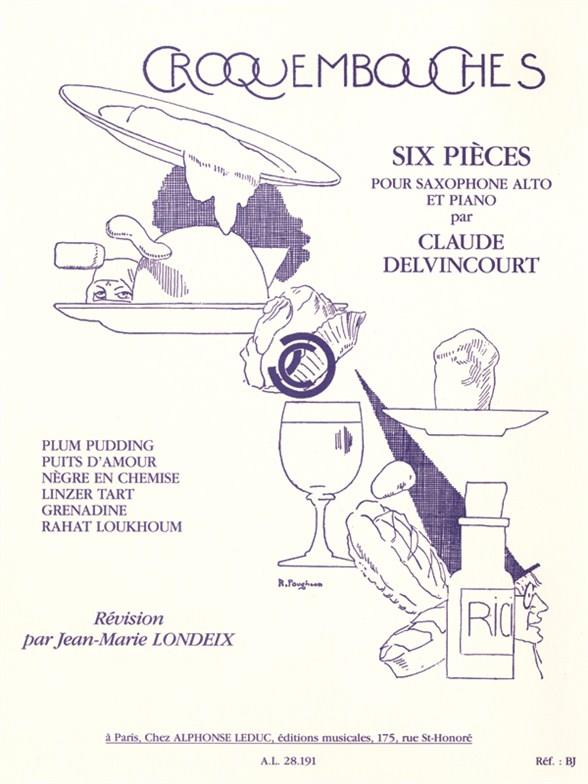 A term usually used to name a French dessert with many choux pastry balls, this Croquembouches by Claude Delvincourt is a set of pieces for Alto Saxophone and Piano with dessert names. Featuring a Plum Pudding, a Puit d'Amour, a Nègre en Chemises, a Linzer Tart, a Grenadine and a Rahat Loukhoum, Croquembouches is enough to enlighten your ears and make your mouth water! For upper beginners / intermediate players, these one-page pieces are really melodic and thoroughly nice to play. This set was revised by Jean-Marie Londeix, aFrench musician who was the student of Marcel Mule and Fernand Oubradous.