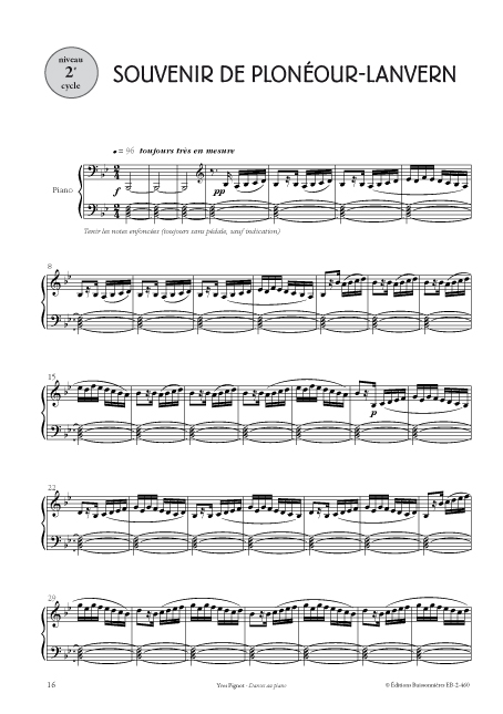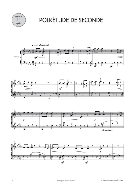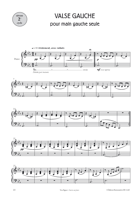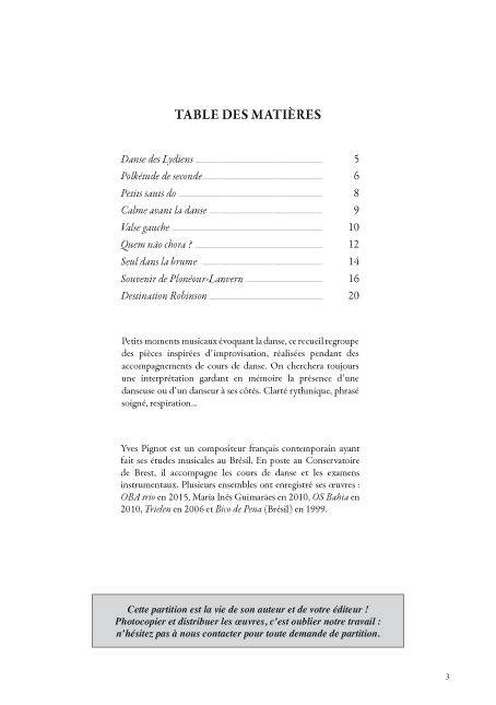 Petits moments musicaux évoquant la danse, ce recueil regroupe des pièces inspirées d’improvisation, réalisées pendant des accompagnements de cours de danse. On cherchera toujours une interprétation gardant en mémoire la présence d’une danseuse ou d’un danseur à ses côtés. Clarté rythmique, phrasé soigné, respiration...