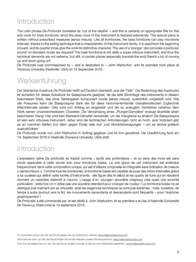 L'expression latine De profundis se traduit comme " (sorti) des profondeurs " et ce sens est sans doute applicable à cette composition solo pour trombone basse. La voix grave de cet instrument est entendue fréquemment dans cette oeuvre unique, qui est d'ailleurs composée en intégralité sans indication de mesure (" senza misura "). Des micro-intervalles, l'usage de mouvements physiques spécifiques et d'un plunger (sourdine chapeau) rendent cette oeuvre aventureuse et unique au répertoire du trombone basse.