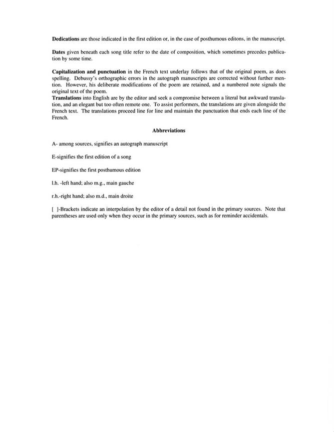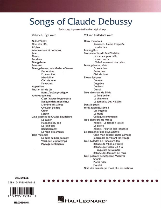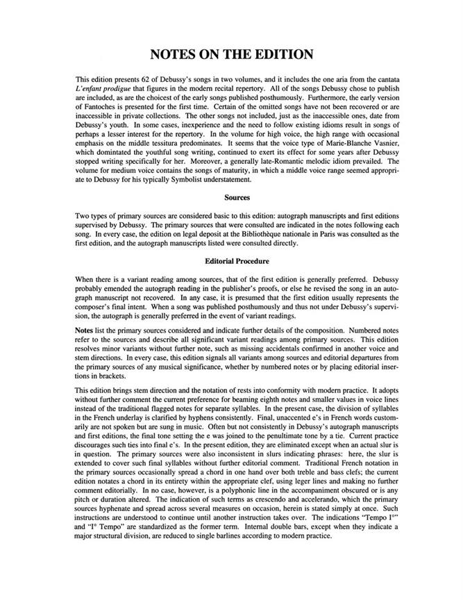 Une édition critique nouvelle majeure d'important répertoire standard avec 61 chansons en 2 volumes. Toutes les chansons sont présentés uniquement dans la clé de l'originale, avec aucune transpositions. Tous les cycles de chansons et les groupements apparaissent dans un des deux volumes. Années en préparation, cette édition est basée sur les sources plus fiables disponibles dans le monde, avec la plus grande partie de la recherche centrée à la Bibliothèque Nationale à Paris. Chaque chanson est présenté avec une traduction en ligne par ligne et notes complet critiques, citant la recherche qu'elle s'applique aux spécificités dans les chansons. Comprend également un glossaire de termes français.
