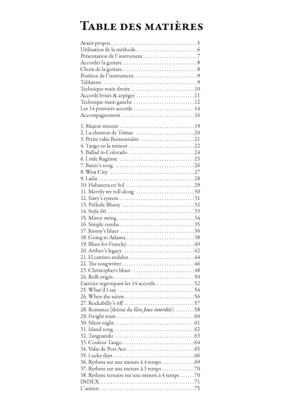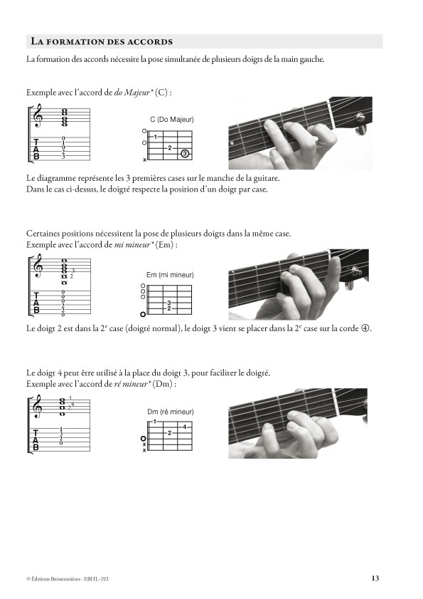 Il est tout à fait possible de commencer la pratique de la guitare en ne jouant que des accords. Cette démarche ne nécessite pas de connaissance préalable du solfège et permet rapidement d'accompagner des chansons. La présente méthode va dans ce sens et propose l'étude progressive des 14 accords les plus simples (majeurs, mineurs et septièmes) ne nécessitant pas l'emploi du barré.