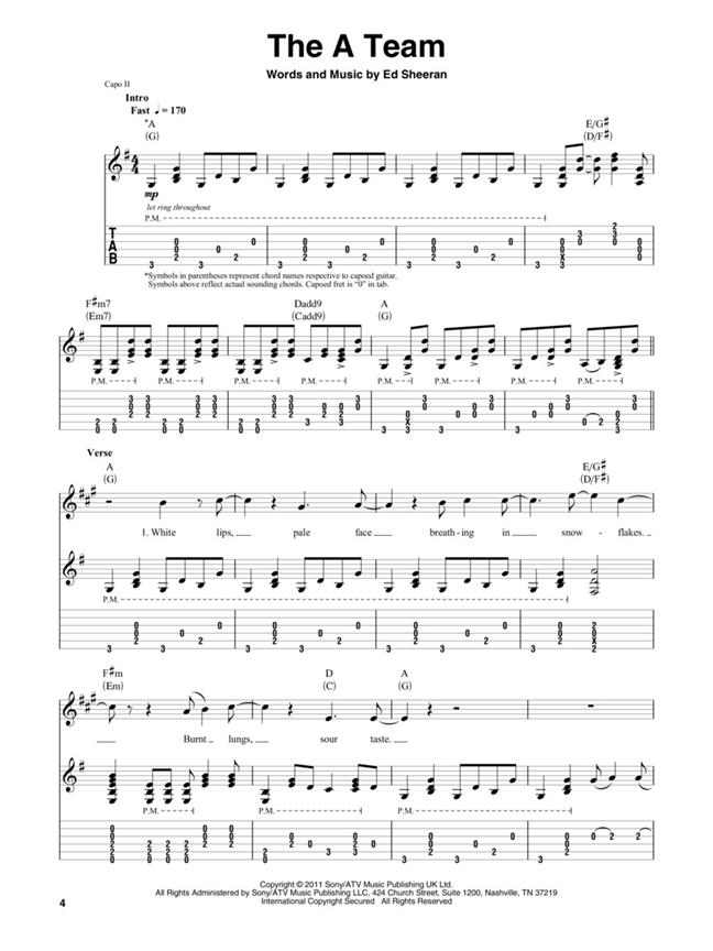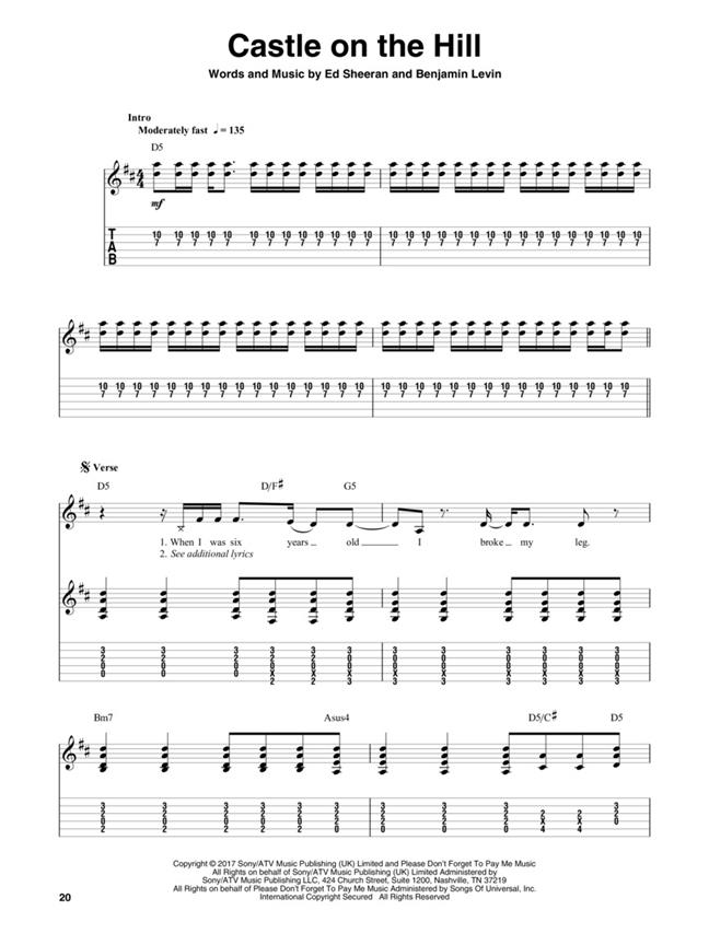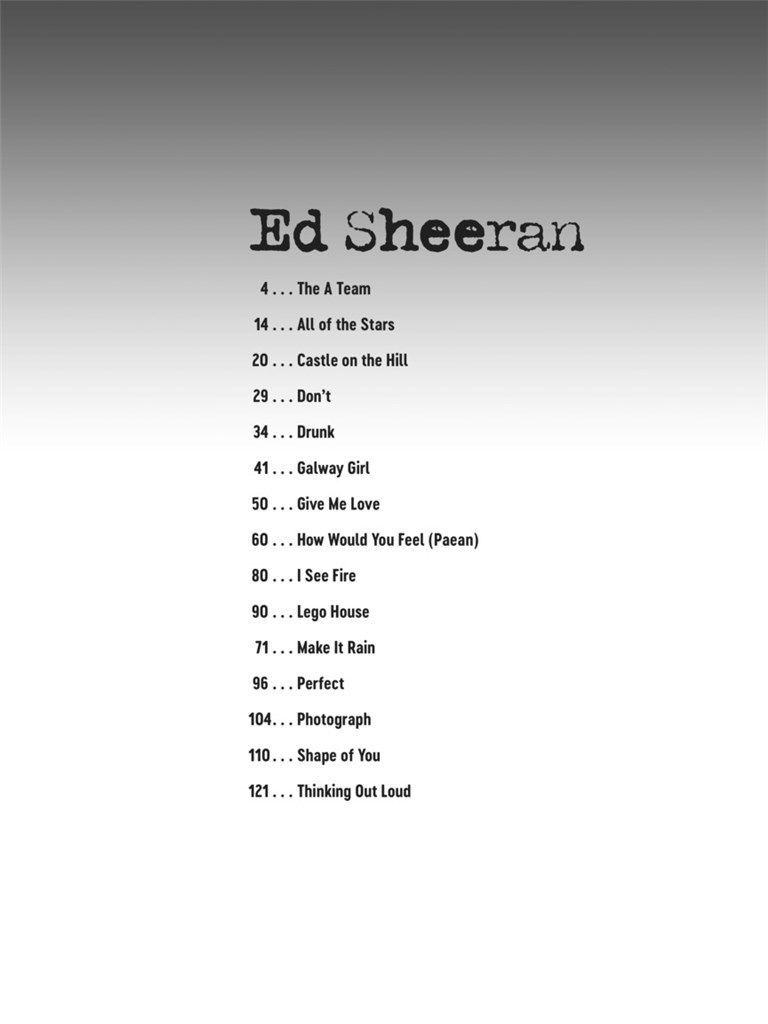 The Deluxe Guitar Play-Along series will help you play songs faster than ever before! Accurate, easy-to-read guitar tab and professional, customizable audio for 15 songs. The interactive, online audio interface includes tempo/pitch control, looping, buttons to turn instruments on or off, and guitar tab with follow-along marker. The price of this book includes access to audio tracks online using the unique code inside. The tracks can also be downloaded and played offline. Now including PLAYBACK+, a multi-functional audio player that allows you to slow down audio, change pitch, set loop points, and pan left or right - available exclusively from Hal Leonard. This volume includes 15 songs: The A Team - All of the Stars - Castle on the Hill - Don't - Drunk - Galway Girl - Give Me Love - How Would You Feel (Paean) - I See Fire - Lego House - Make It Rain - Perfect - Photograph - Shape of You - Thinking Out Loud.