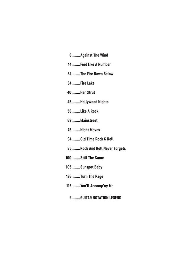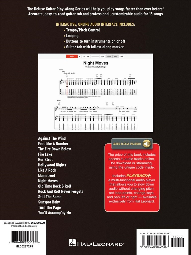 The Deluxe Guitar Play-Along series will help you play songs faster than ever before! Accurate, easy-to-read guitar tab and professional, customizable audio for 15 songs. The interactive, online audio interface includes tempo/pitch control, looping, buttons to turn instruments on or off, and guitar tab with follow-along marker. The price of this book includes access to audio tracks online using the unique code inside. The tracks can also be downloaded and played offline. Now including PLAYBACK+, a multi-functional audio player that allows you to slow down audio, change pitch, set loop points, and pan left or right - available exclusively from Hal Leonard. This volume includes 15 songs: Against the Wind · Feel like a Number · The Fire down Below · Fire Lake · Her Strut · Hollywood Nights · Like a Rock · Mainstreet · Night Moves · Old Time Rock & Roll · Rock and Roll Never Forgets · Still the Same · Sunspot Baby · Turn the Page · You'll Accomp'ny Me.