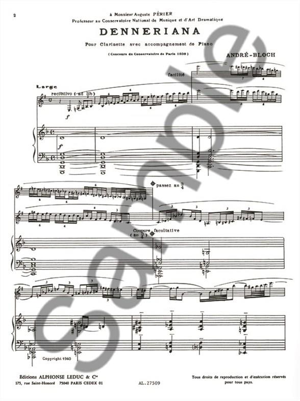 Composed for the Paris Conservatoire contest in 1938, Denneriana is a piece for Clarinet with Piano accompaniment, by Andre Bloch. Its title is a reference to the creator of the Clarinet Johann Christoph Denner. Ideal to demonstrate the skills of advanced players, this piece is highly lyrical and really enjoyable for both the players and the audience. It starts with a grandiose introduction, perfect for this work. It also includes a Clarinet Solo cadenza half-way through the piece and finishes in a highly harmonious way. This piece requires numerous skills and good knowledge of the instrument. Andre Bloch (1873-1960) was a French musician, composer and professor. He won the Grand Prix de Rome for his piece named Cantata. Amongst his most famous students were Jehan Alain and Fernand Oubradous.
