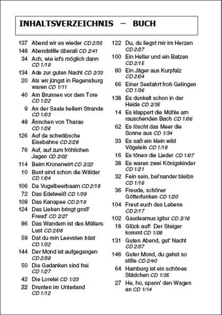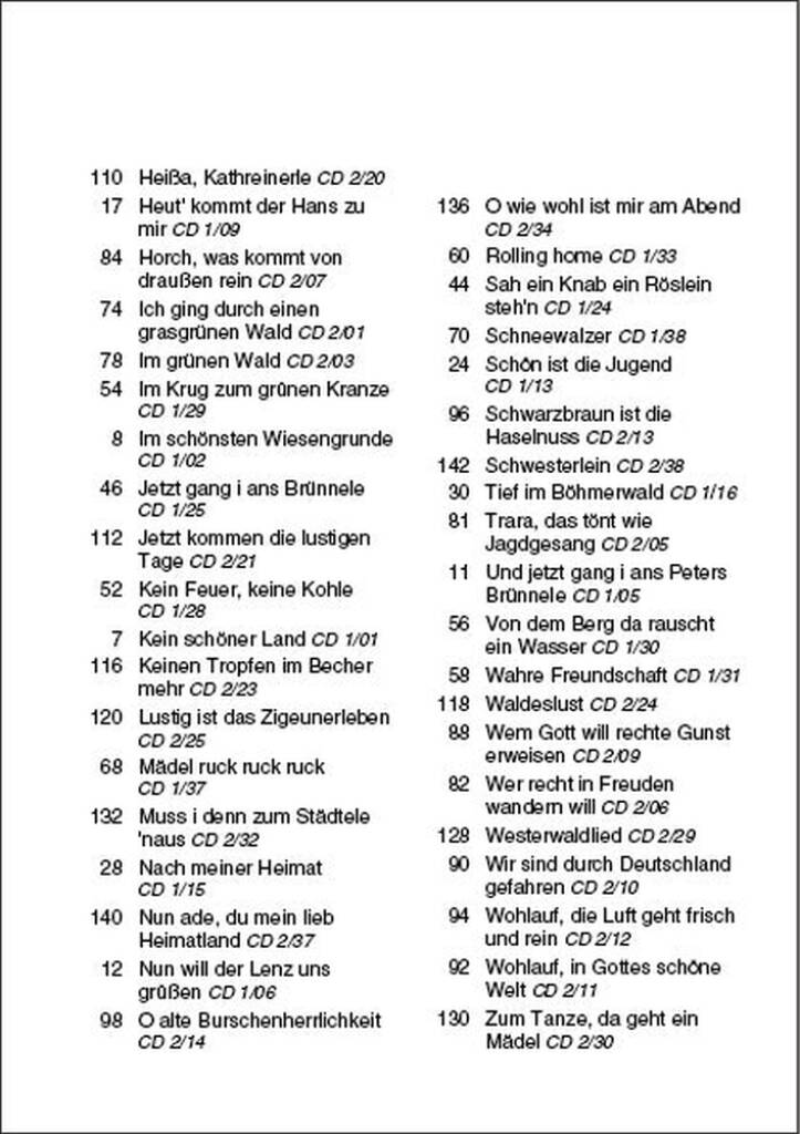 This must-have collection contains the most beautiful and best known German traditional ‘Volkslieder’. With extra large text and practical spiral binding, this book is accompanied by 2 CDs featuring each song playedand sung for up to 4 verses (2.5 hrs play time).