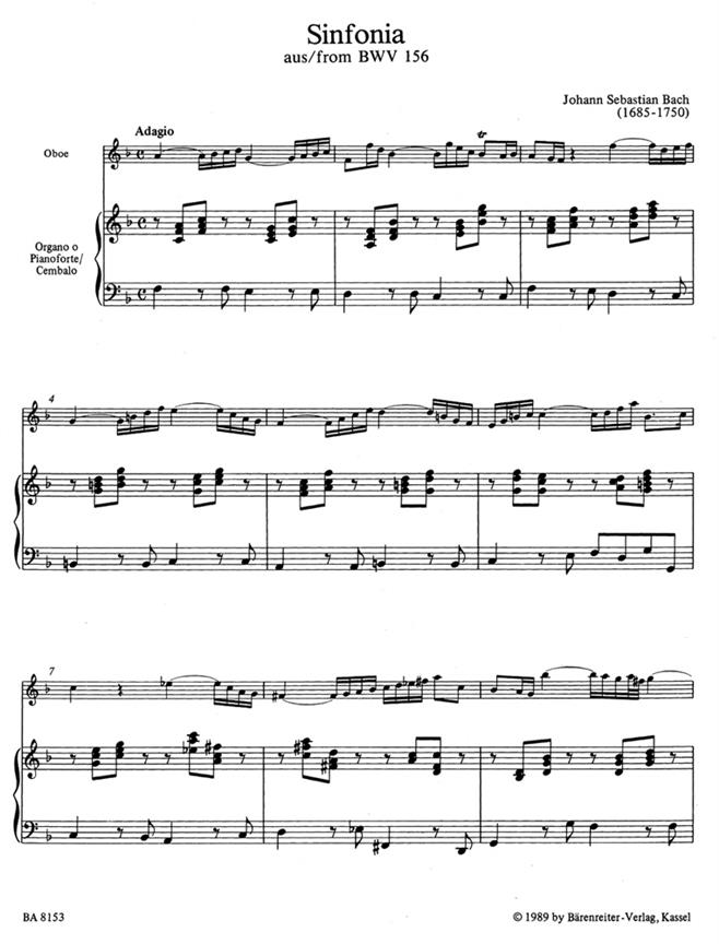 The numerous orchestral passages from Bach’s cantatas in which the oboe obligato is prominent, show how well Bach composed for the Oboe. In order to make it possible for individual oboists to play these passages with keyboard accompaniment, this edition reproduces the respective passages in piano reduction. The movement from BWV 76, which was composed for oboe d’amore, is printed in its original form as well as in version for oboe and therefore does justice to both instruments. All movements can be presented without hesitation as complete performance pieces in the classroom, for concerts, and church. Sinfonien aus: Kantate 156 'Ich steh mit einem Fuß imGrabe' Kantate12 'Weinen, Klagen, Sorgen, Zagen' Kantate 21 'Ich hatte viel Bekümmernis' Osteroratorium BWV 249 Kantate 76 'Die Himmel erzählen die Ehre Gottes