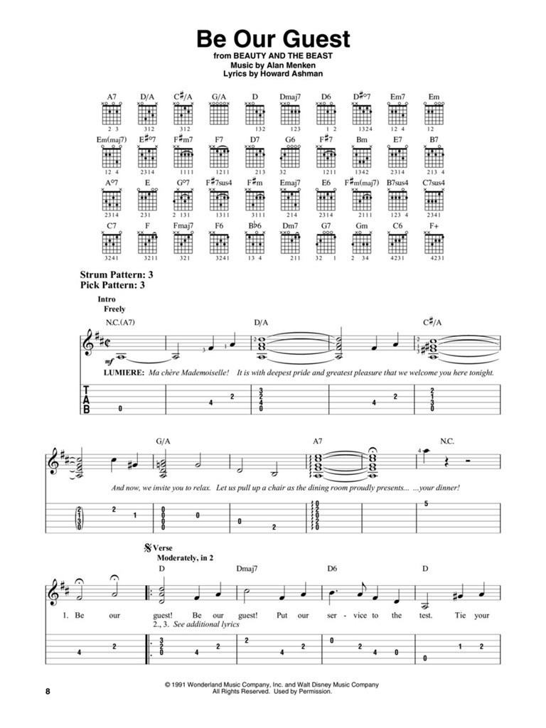 Beginning guitarists will love the opportunity to play the top-notch Disney songs in this collection for easy guitar with tab. Includes: Be Our Guest - Friend like Me - Hakuna Matata - Heigh Ho - I've Got No Strings - In Summer - Supercalifragilisticexpialidocious - Under the Sea - Winnie the Pooh - Yo Ho (A Pirate's Life for Me) - You're Welcome - and more.
