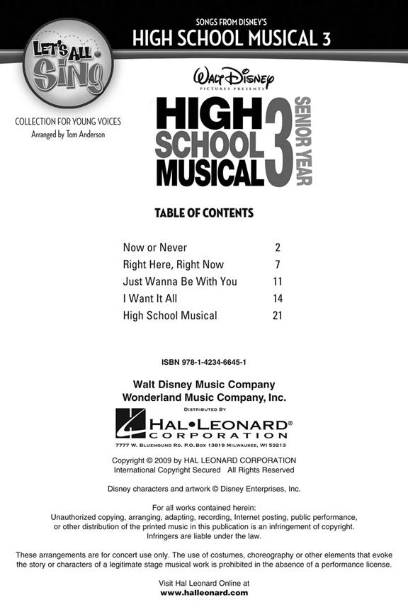 Chansons issues de la comédie musicale de disney 'High School Musical 3' arrangées pour piano et voix (unisson avec options d'harmonie).